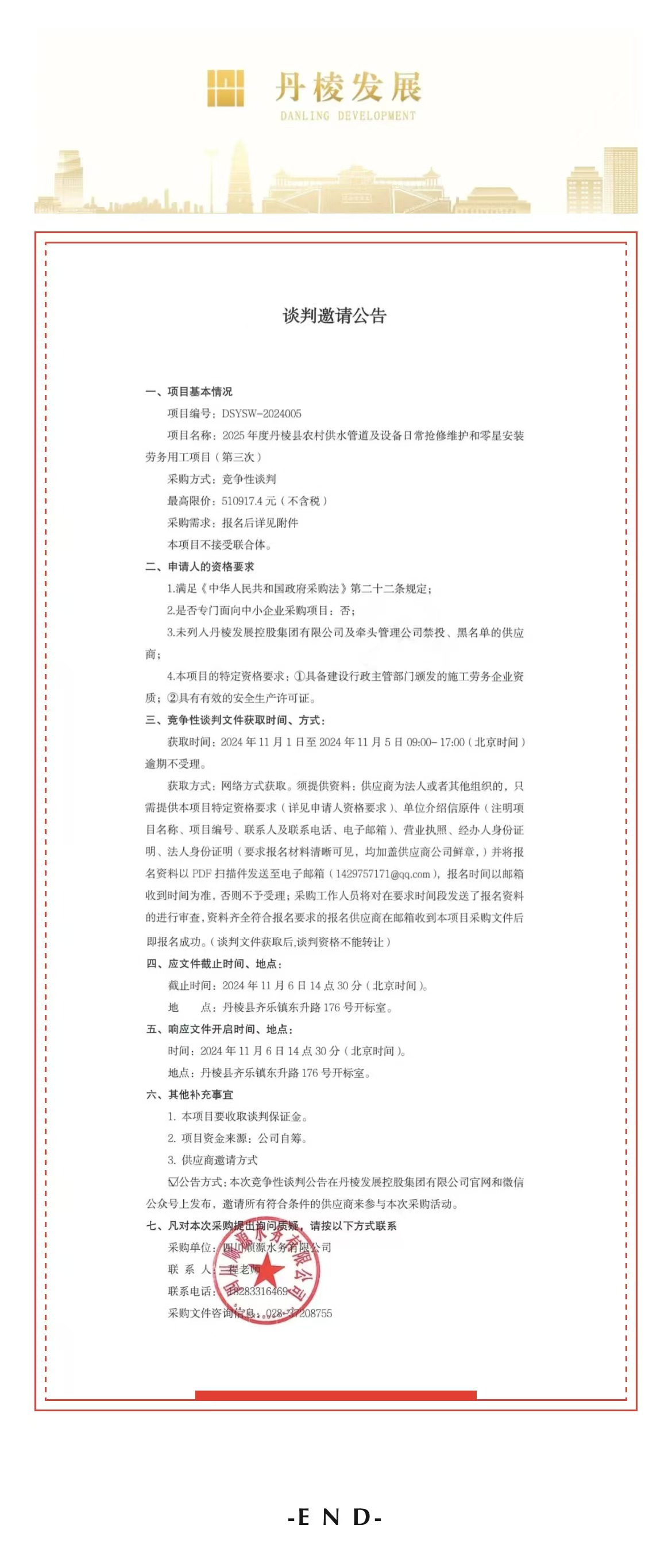 2025年度丹棱縣農(nóng)村供水管道及設(shè)備日常搶修維護(hù)和零星安裝勞務(wù)用工項(xiàng)目(第三次)談判邀請公告