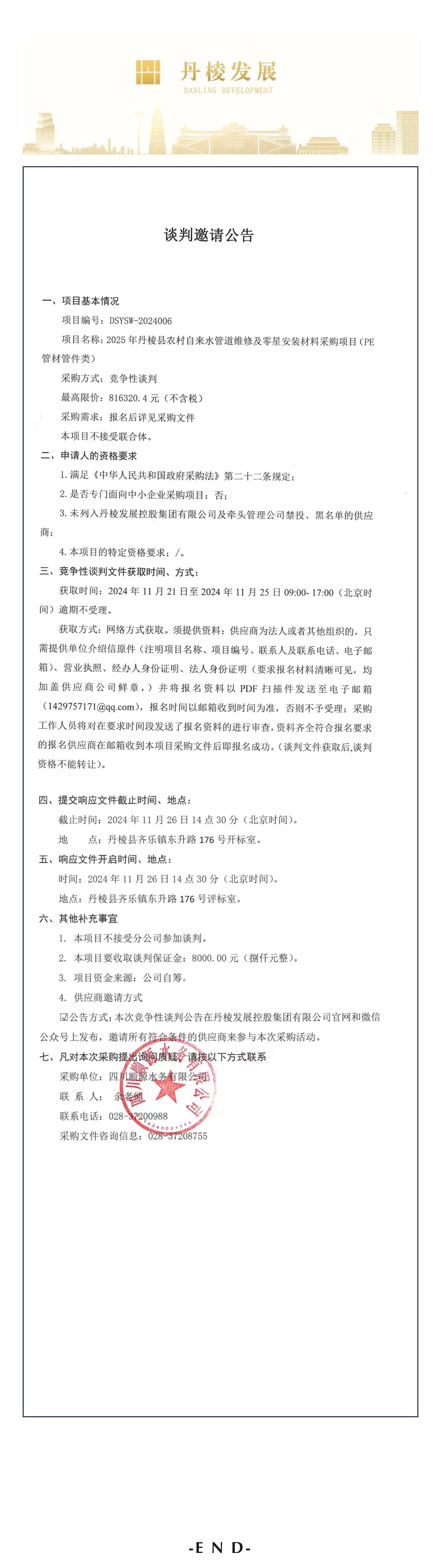 2025年丹棱縣農(nóng)村自來水管道維修及零星安裝材料采購項目(PE管材管件類)談判邀請公告