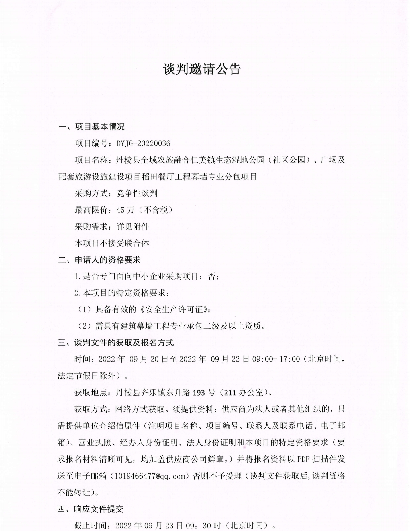 丹棱縣全域農(nóng)旅融合仁美鎮(zhèn)生態(tài)濕地公園(社區(qū)公園)、廣場及配套旅游設(shè)施建設(shè)項目稻田餐廳工程幕墻專業(yè)分包項目談判邀請公告