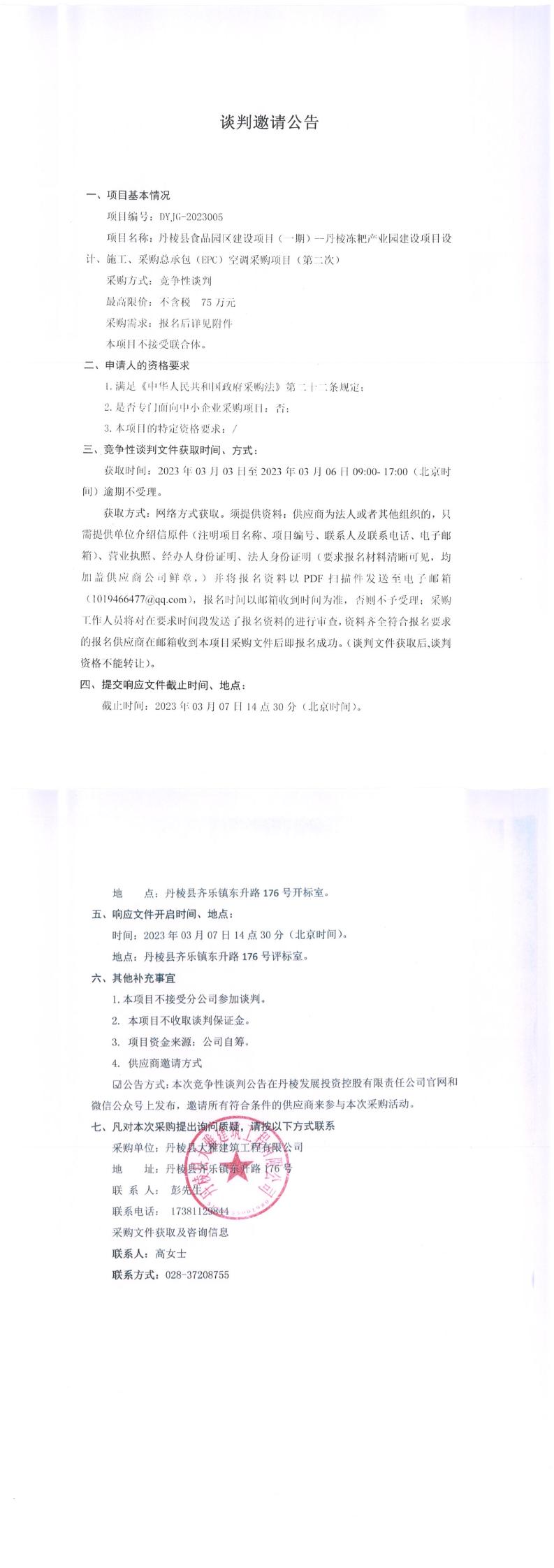 丹棱縣食品園區(qū)建設項目(一期)--丹棱凍粑產(chǎn)業(yè)園建設項目設計、施工、采購總承包(EPC)空調(diào)采購項目(第二次)談判邀請公告