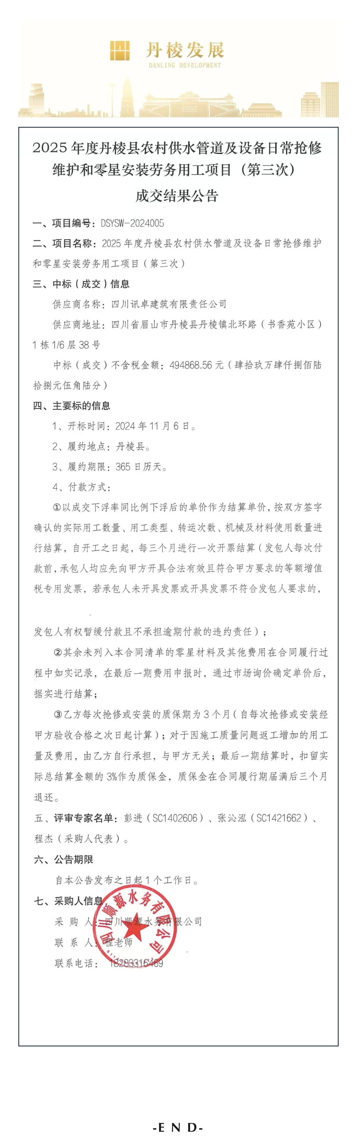 2025年度丹棱縣農(nóng)村供水管道及設(shè)備日常搶修維護和零星安裝勞務用工項目(第三次)成交結(jié)果公告