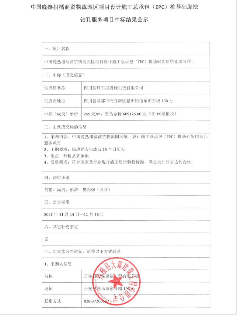 【大雅建筑公司】中國晚熟柑橘商貿(mào)物流園區(qū)項目設(shè)計施工總承包(EPC)樁基礎(chǔ)旋挖鉆孔服務(wù)項目中標(biāo)結(jié)果公示