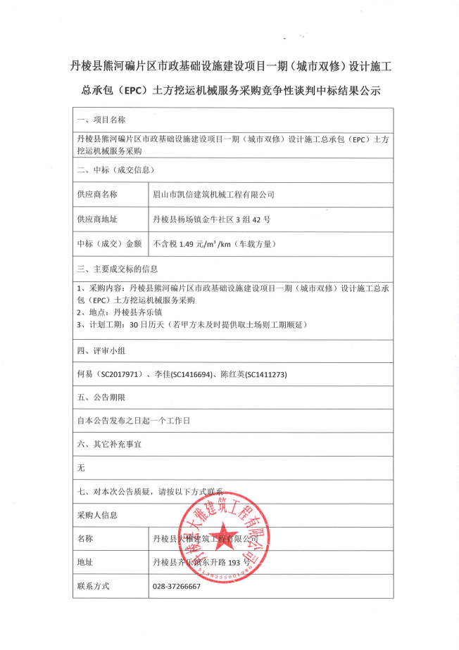 丹棱縣熊河碥片區(qū)市政基礎(chǔ)設(shè)施建設(shè)項目一期(城市雙修)設(shè)計施工 總承包(EPC)土方挖運機(jī)械服務(wù)采購競爭性談判中標(biāo)結(jié)果公示