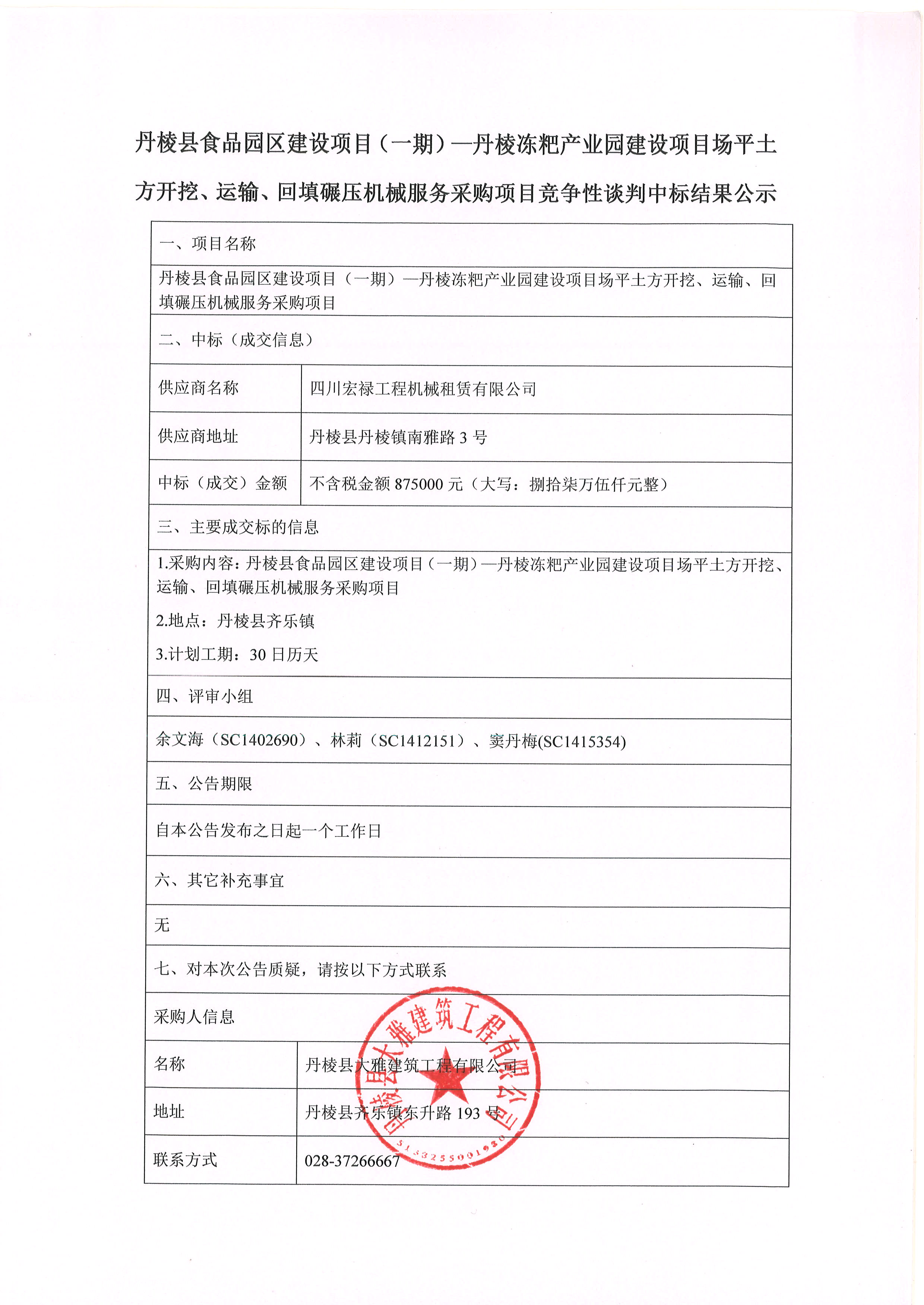 丹棱縣食品園區(qū)建設項目(一期)-丹棱凍粑產業(yè)園建設項目場平土 方開挖、運輸、回填碾壓機械服務采購項目競爭性談判中標結果公示