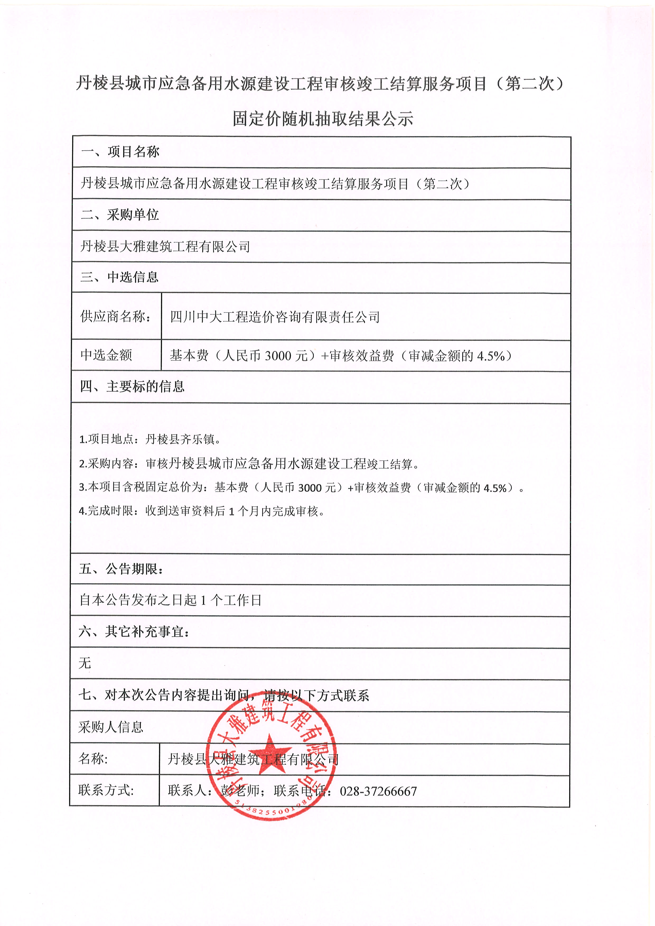 丹棱縣城市應急備用水源建設工程審核竣工結算服務項目(第二次) 固定價隨機抽取結果公示