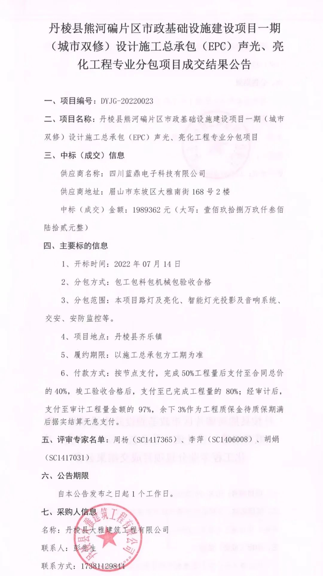 丹棱縣熊河碥片區(qū)市政基礎設施建設項目一期(城市雙修)設計施工總承包(EPC)聲光、亮化工程專業(yè)分包項目成交結果公告
