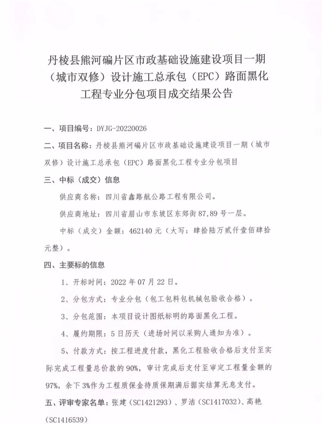 丹棱縣熊河碥片區(qū)市政基礎(chǔ)設(shè)施建設(shè)項(xiàng)目一期(城市雙修)設(shè)計(jì)施工總承包(EPC)路面黑化工程專(zhuān)業(yè)分包項(xiàng)目成交結(jié)果公告