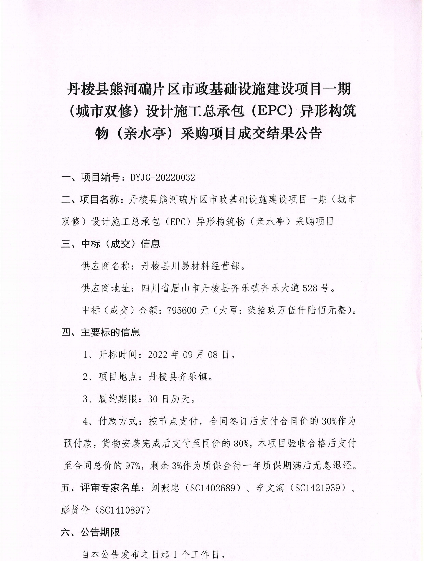丹棱縣熊河碥片區(qū)市政基礎(chǔ)設(shè)施建設(shè)項目一期(城市雙修)設(shè)計施工總承包(EPC)異形構(gòu)筑物(親水亭)采購項目成交結(jié)果公告