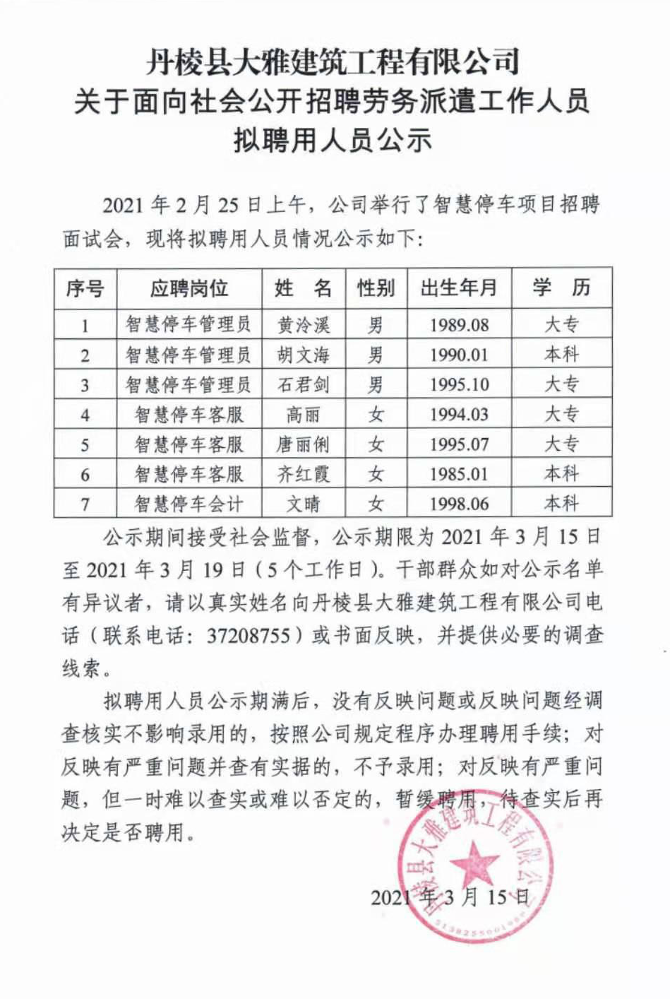 【大雅建筑公司】關(guān)于面向社會(huì)公開(kāi)招聘勞務(wù)派遣工作人員擬聘用人員公示