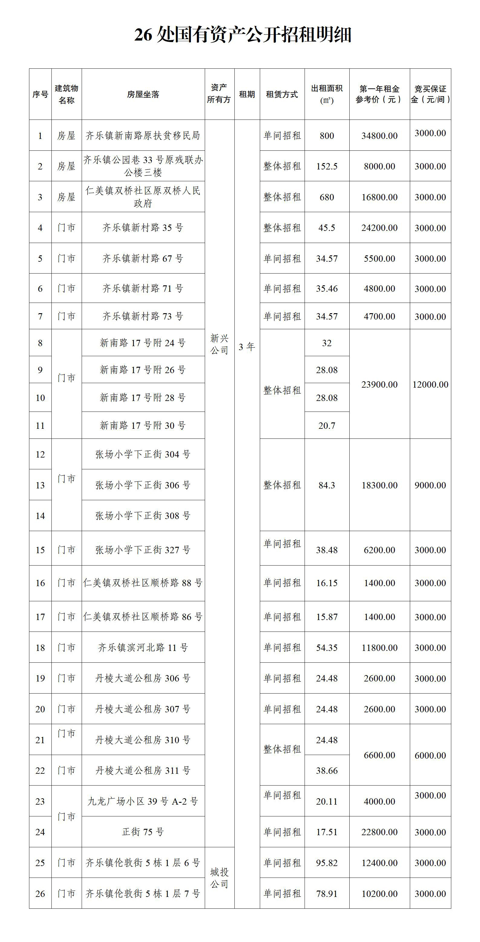丹棱縣26處國有資產3年租賃權拍賣(詳見拍賣文件)。