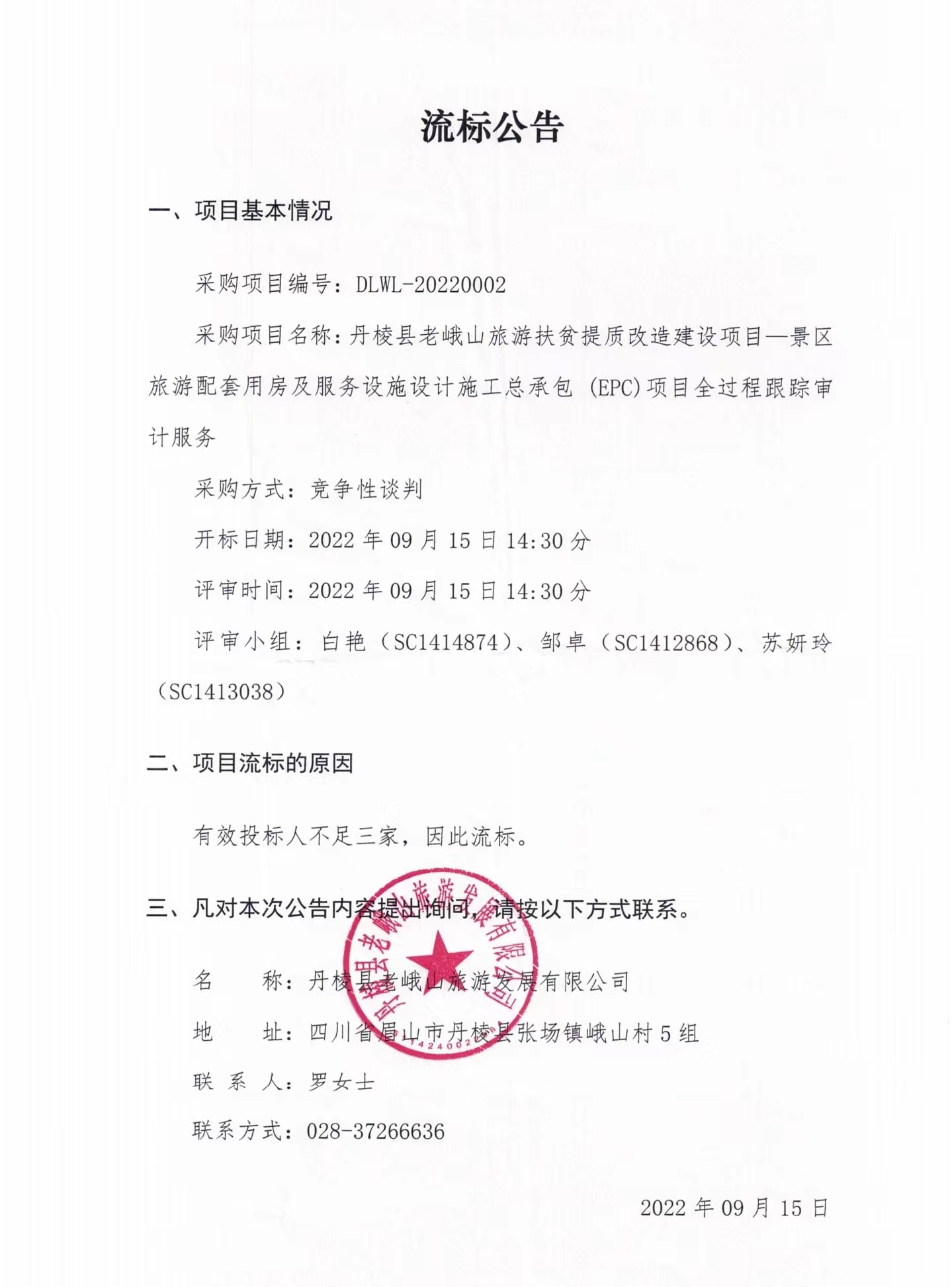 丹棱縣老峨山旅游扶貧提質(zhì)改造建設項目--景區(qū)旅游配套用房及服務設施設計施工總承包(EPC)項目全過程跟蹤審計服務流標公告