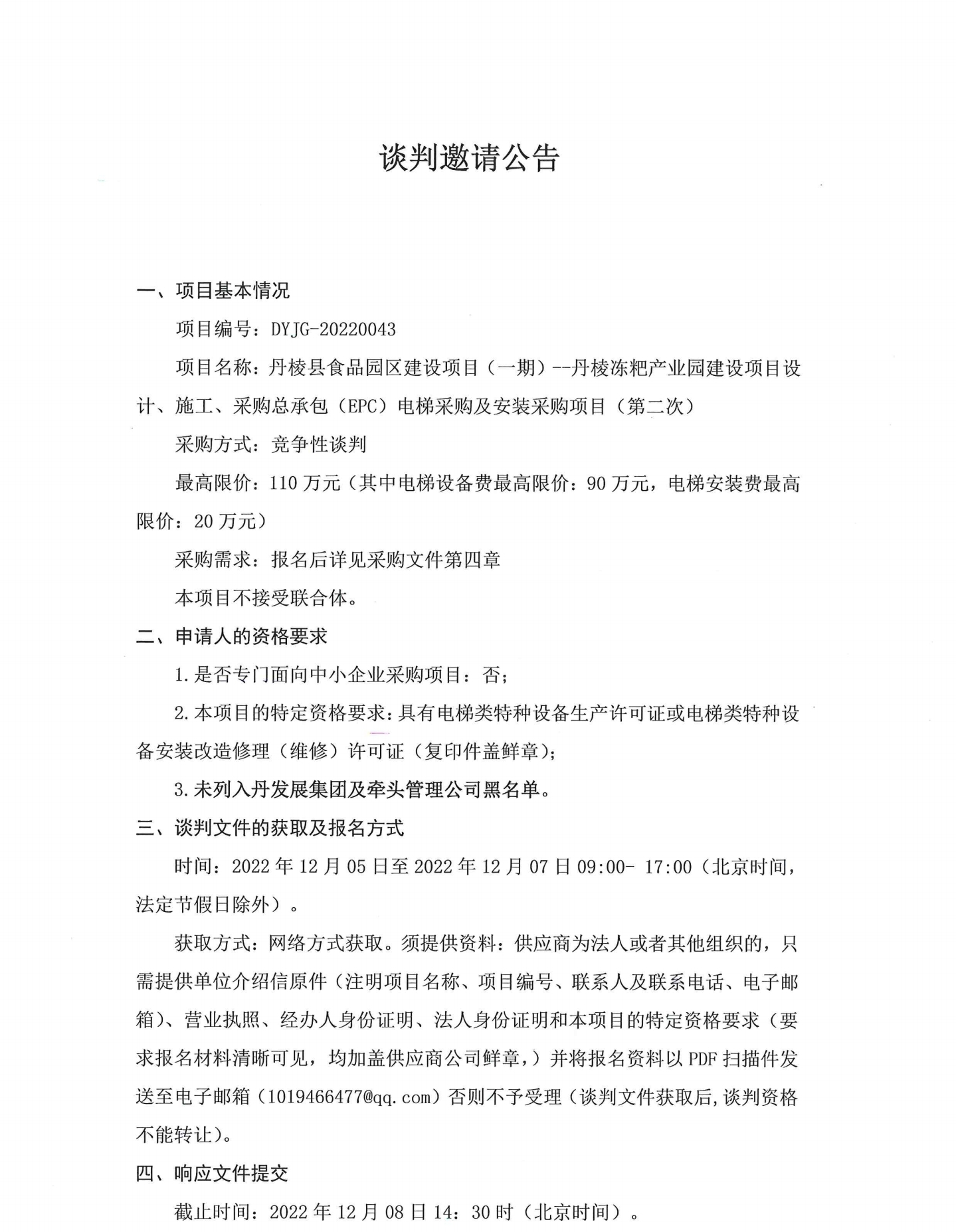 丹棱縣食品園區(qū)建設(shè)項(xiàng)目 (一期)--丹樓凍把產(chǎn)業(yè)園建設(shè)項(xiàng)目設(shè)計(jì)、施工、采購總承包 (EPC) 電梯采購及安裝采購項(xiàng)目 (第二次)談判邀請(qǐng)公告