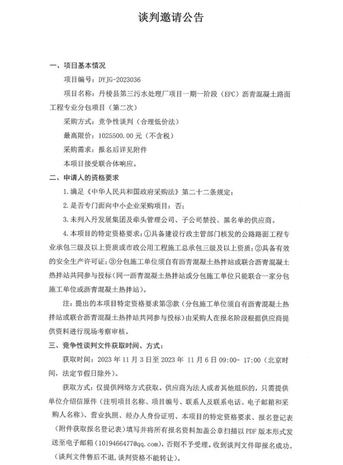 丹棱縣第三污水處理廠項目一期一階段(EPC)瀝青混凝土路面工程專業(yè)分包項目(第二次)談判邀請公告