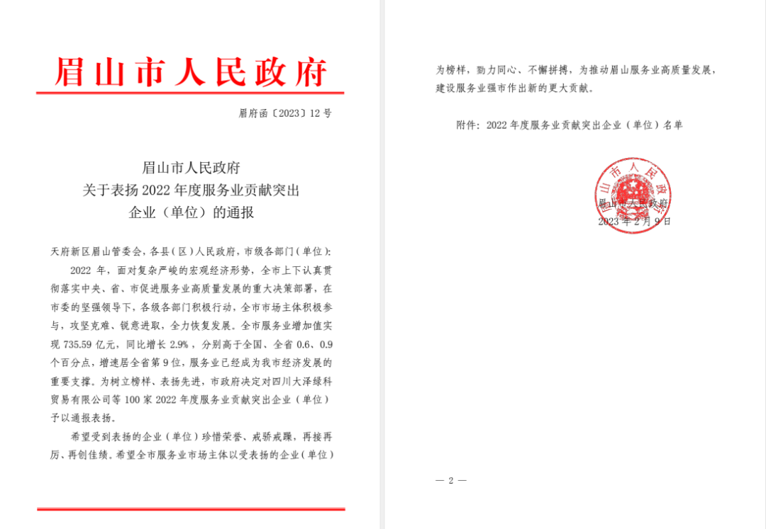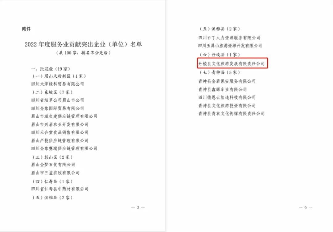 點(diǎn)贊!丹棱縣文化旅游發(fā)展有限責(zé)任公司榮獲眉山市2022年度服務(wù)業(yè)貢獻(xiàn)突出企業(yè)榮譽(yù)稱(chēng)號(hào)